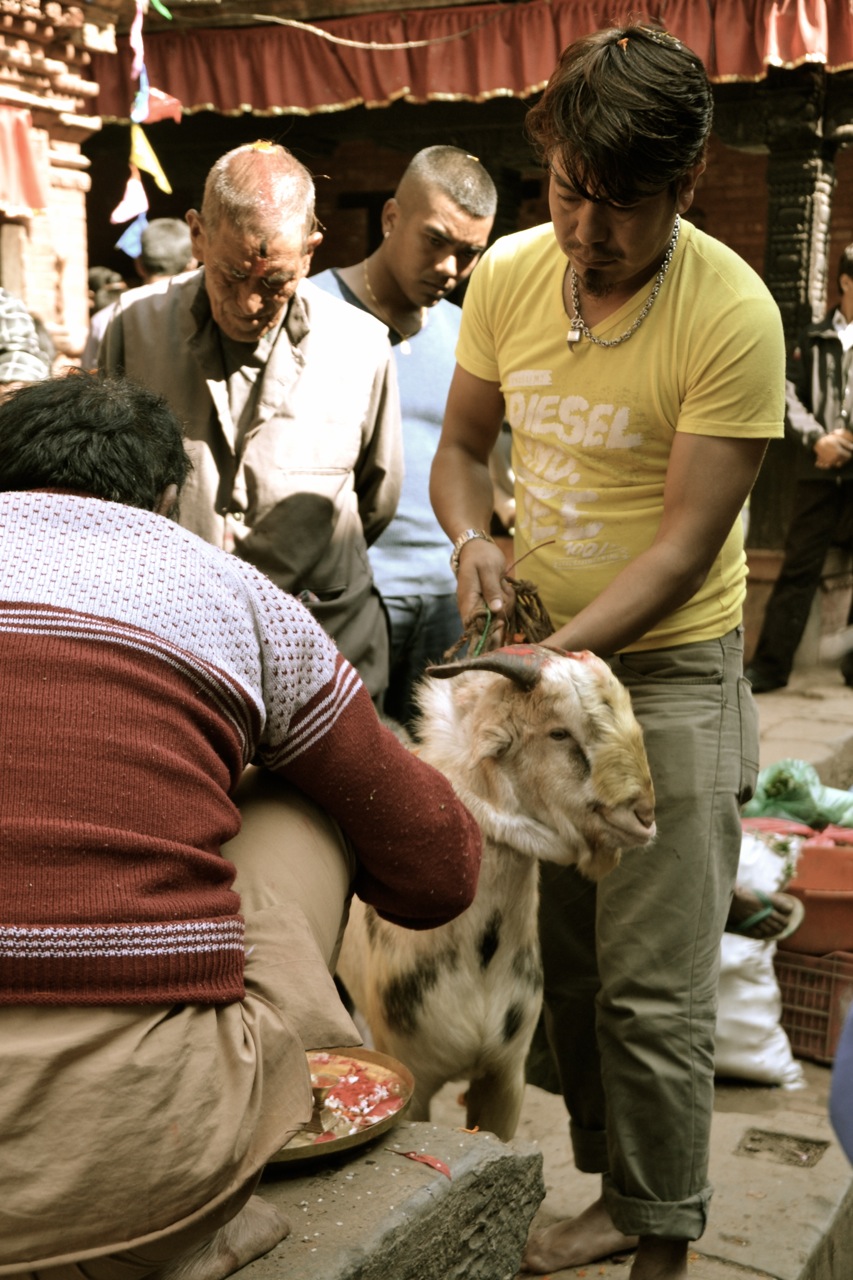 In Bahktapor (near Kathmandu) we stumbled upon the sacrificing of a goat – this was the preparation