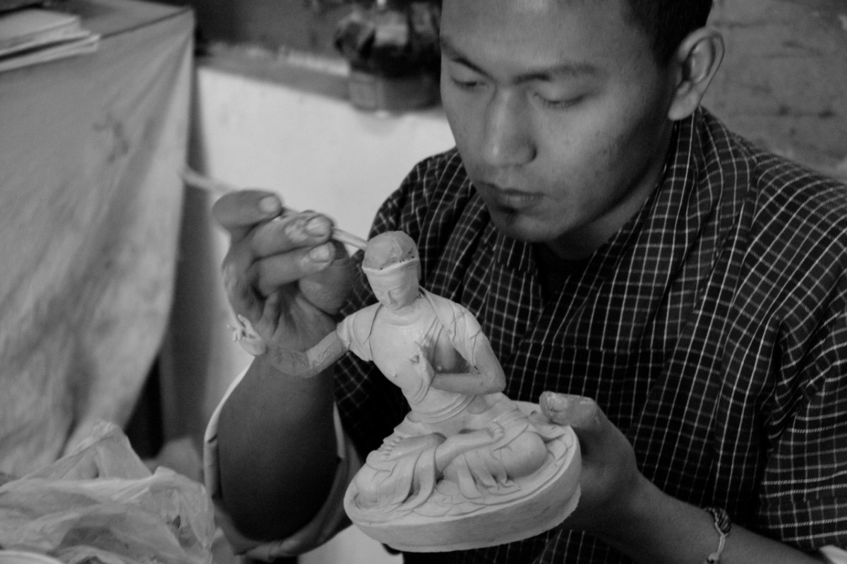 Boy sculpting a statue of Buddha