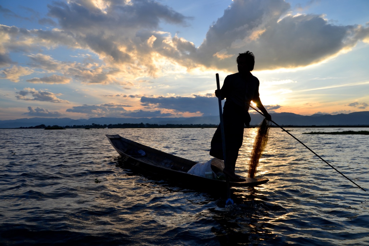 Fisherman on Inle Lake at sunset